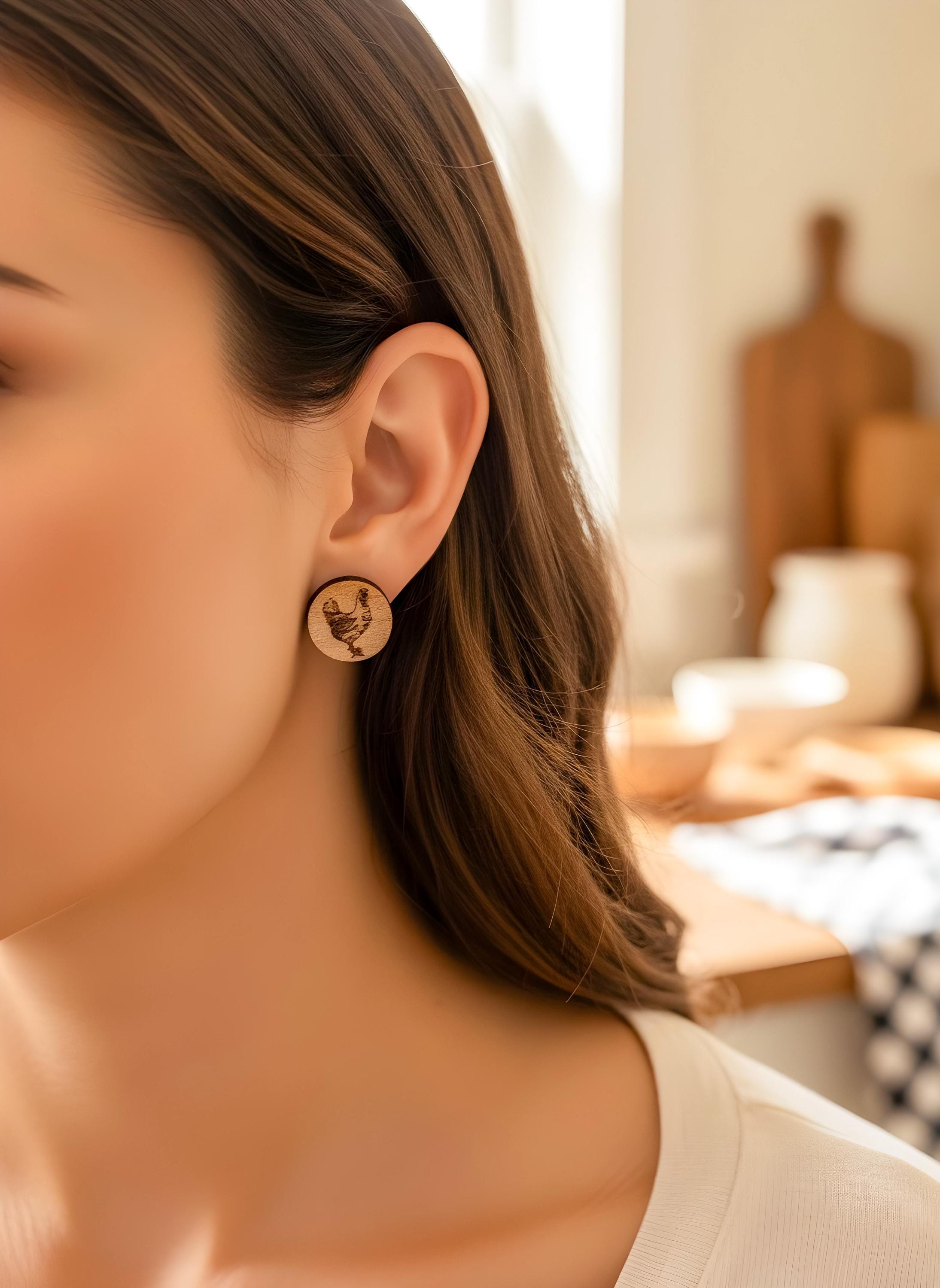 Discover our adorable wooden chicken stud earrings, perfect for all chicken lovers! These natural wood earrings are ideal for farm enthusiasts, homesteaders, and any "crazy chicken lady." Crafted from cherry wood with laser-engraved details, they add a charming and rustic touch to your everyday look.