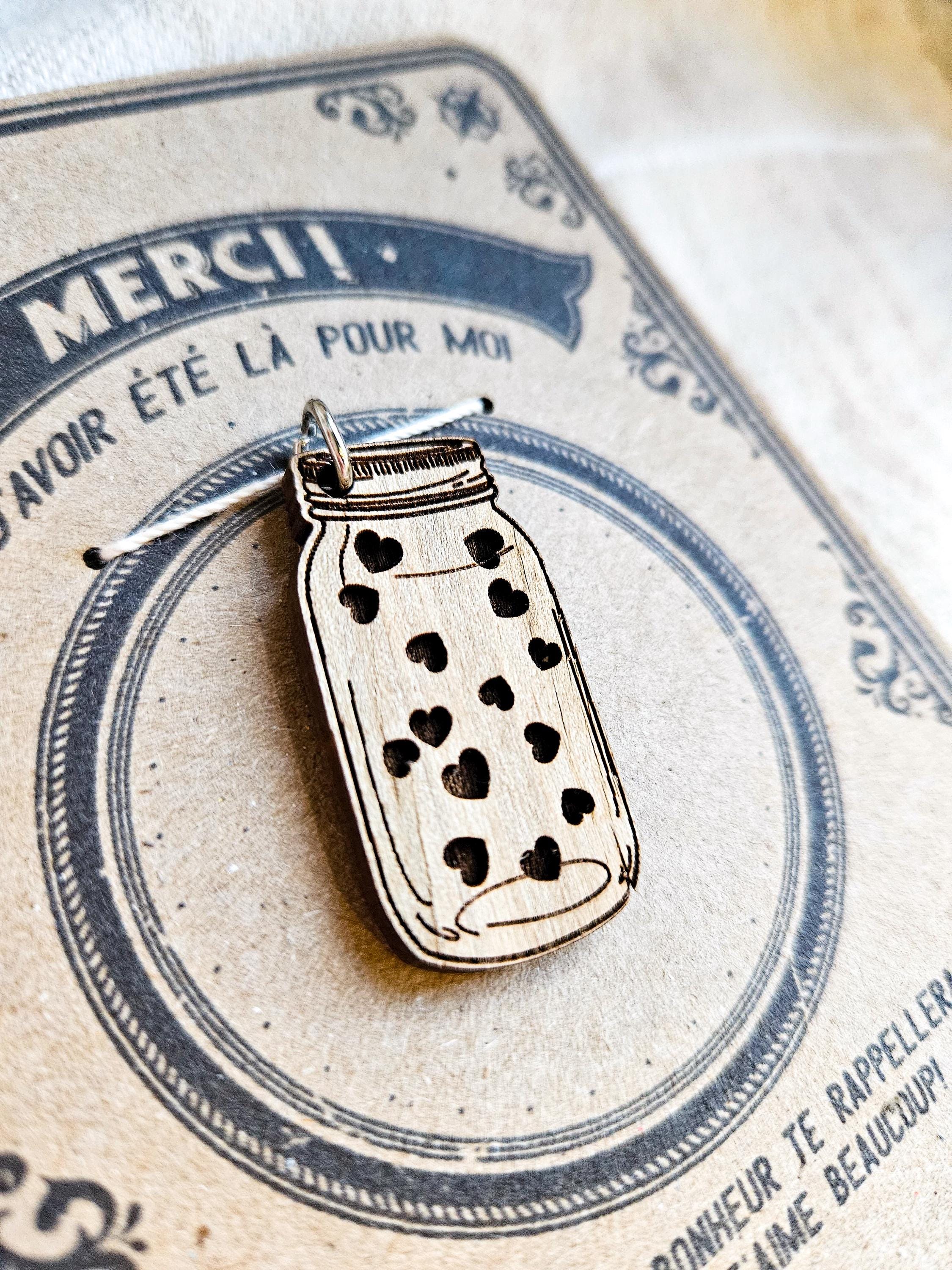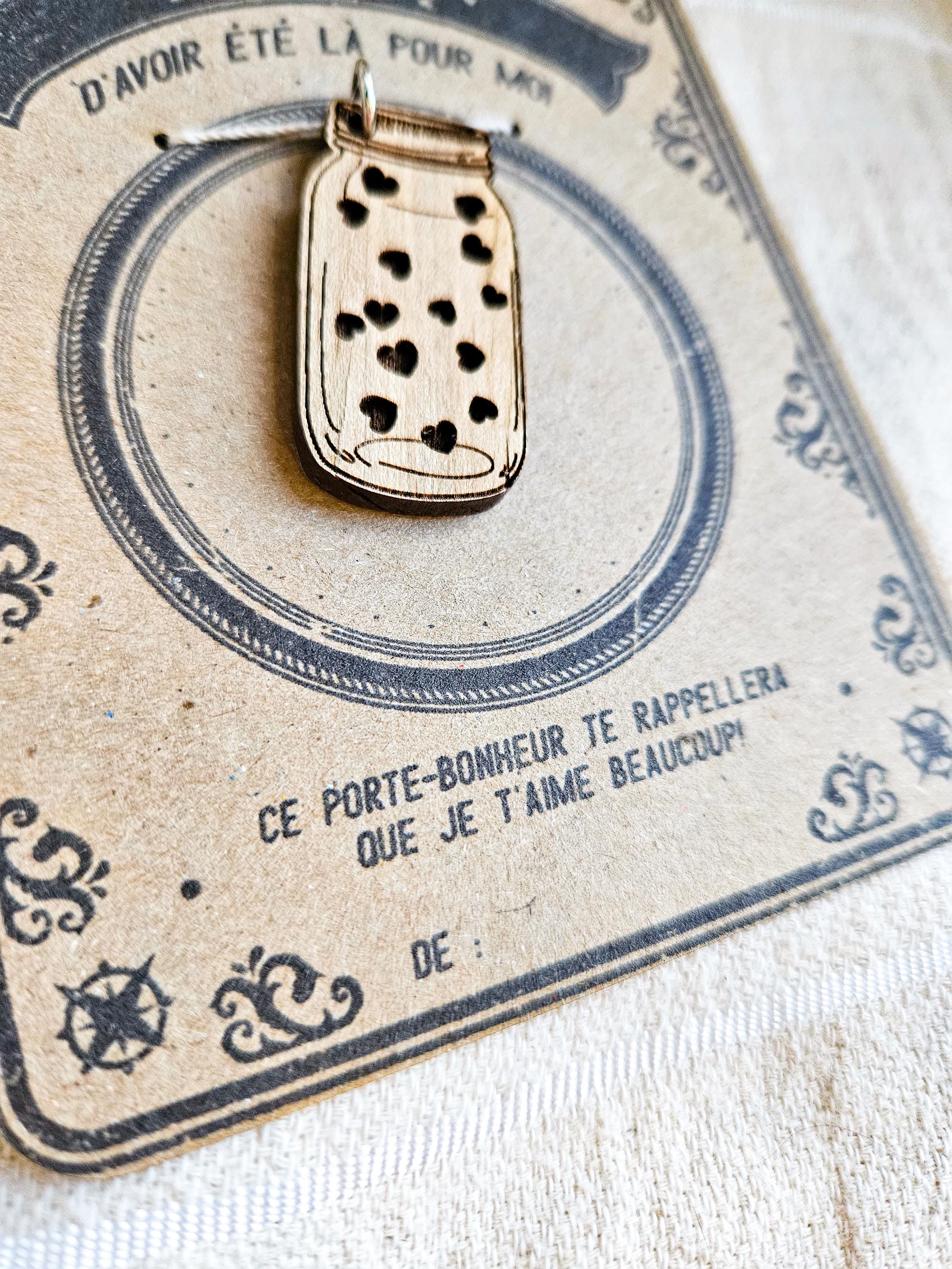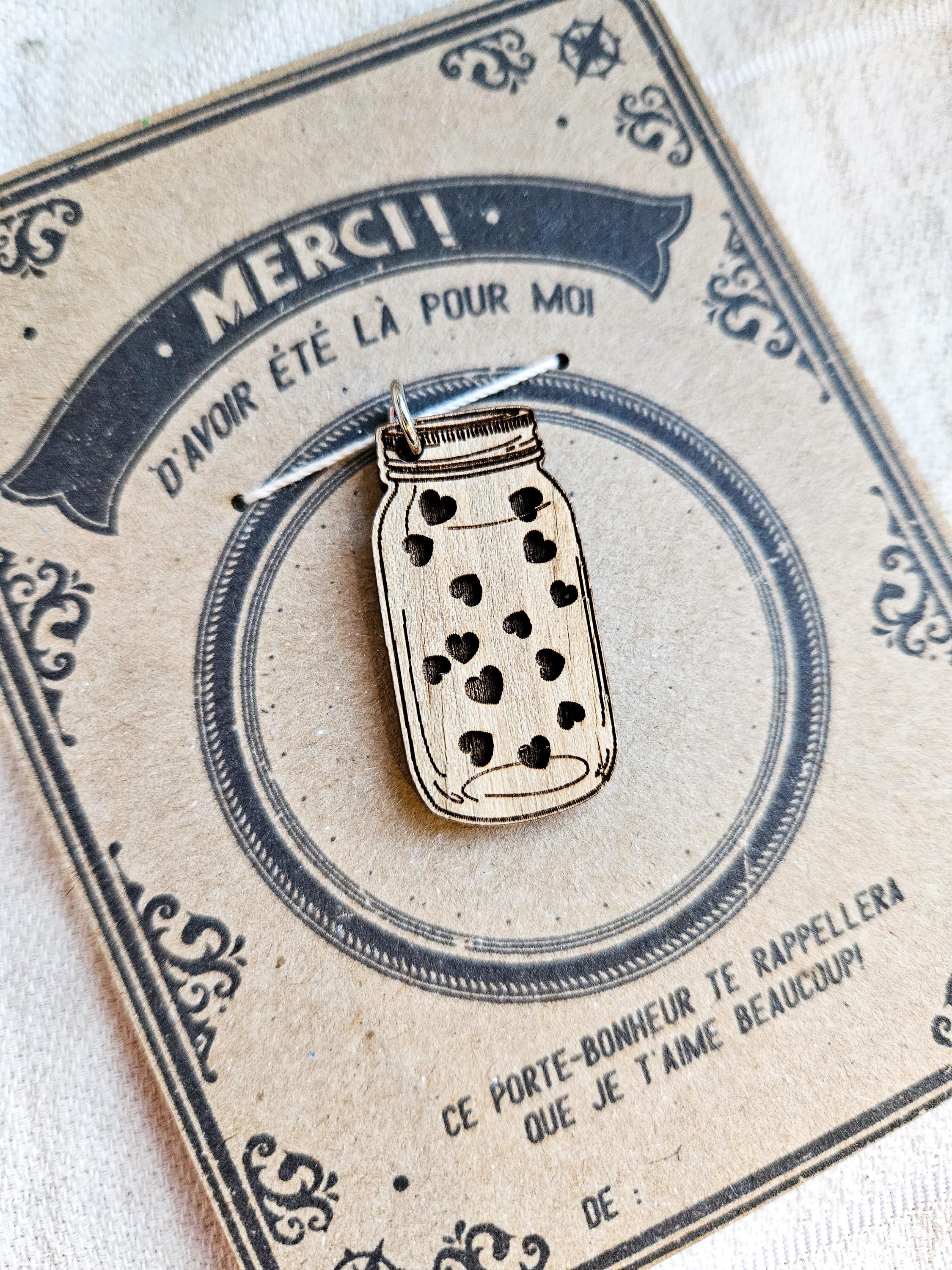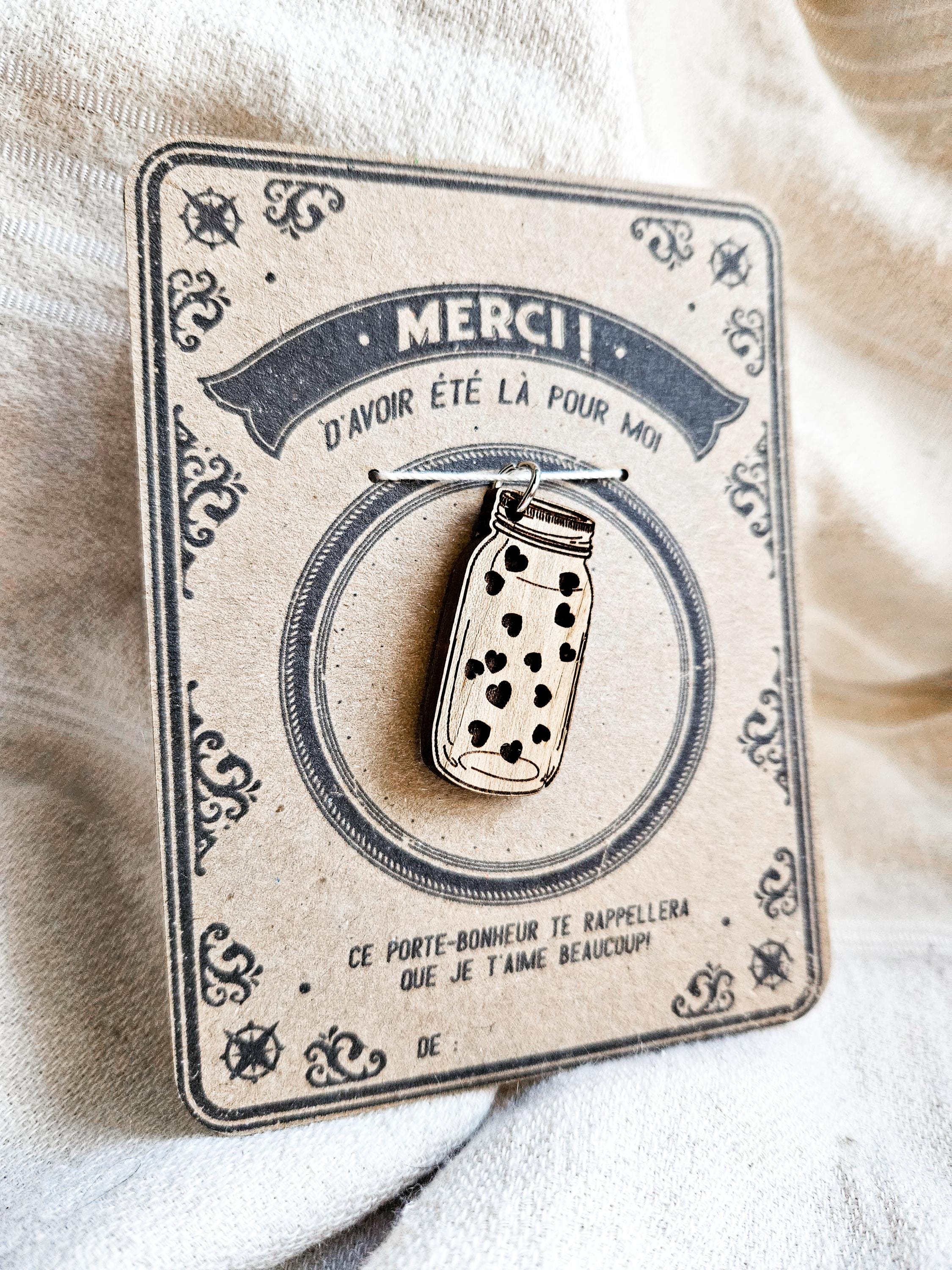 Each little heart inside the jar is a reminder of the attention and care she gives every day. Made in Quebec from sustainable materials, it becomes a lucky charm to keep preciously, on a desk, a key ring, or in a keepsake box.