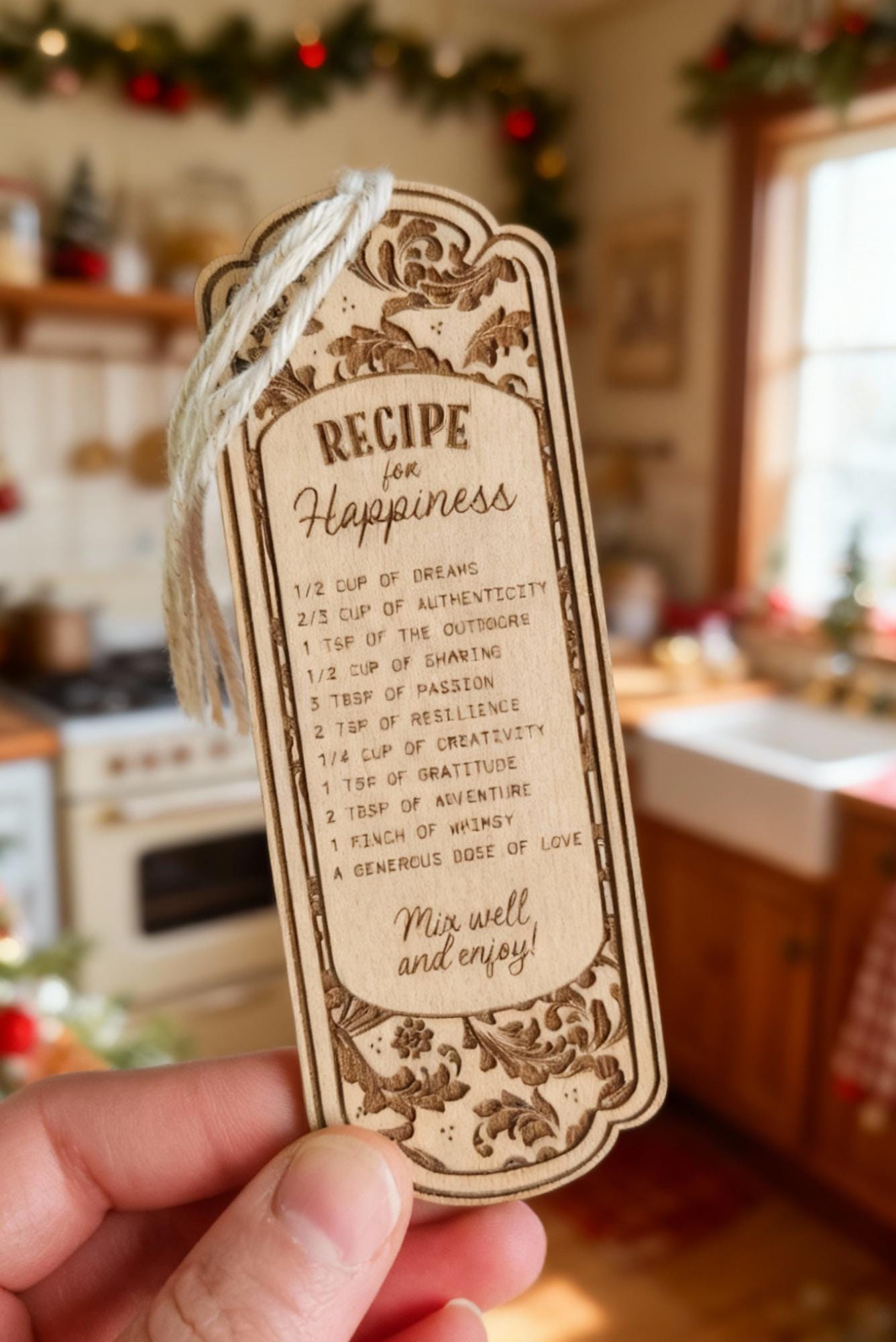 This beautiful laser-engraved wooden bookmark features a “Recipe for Happiness” — a poetic mix of dreams, gratitude, and love to enjoy every day.