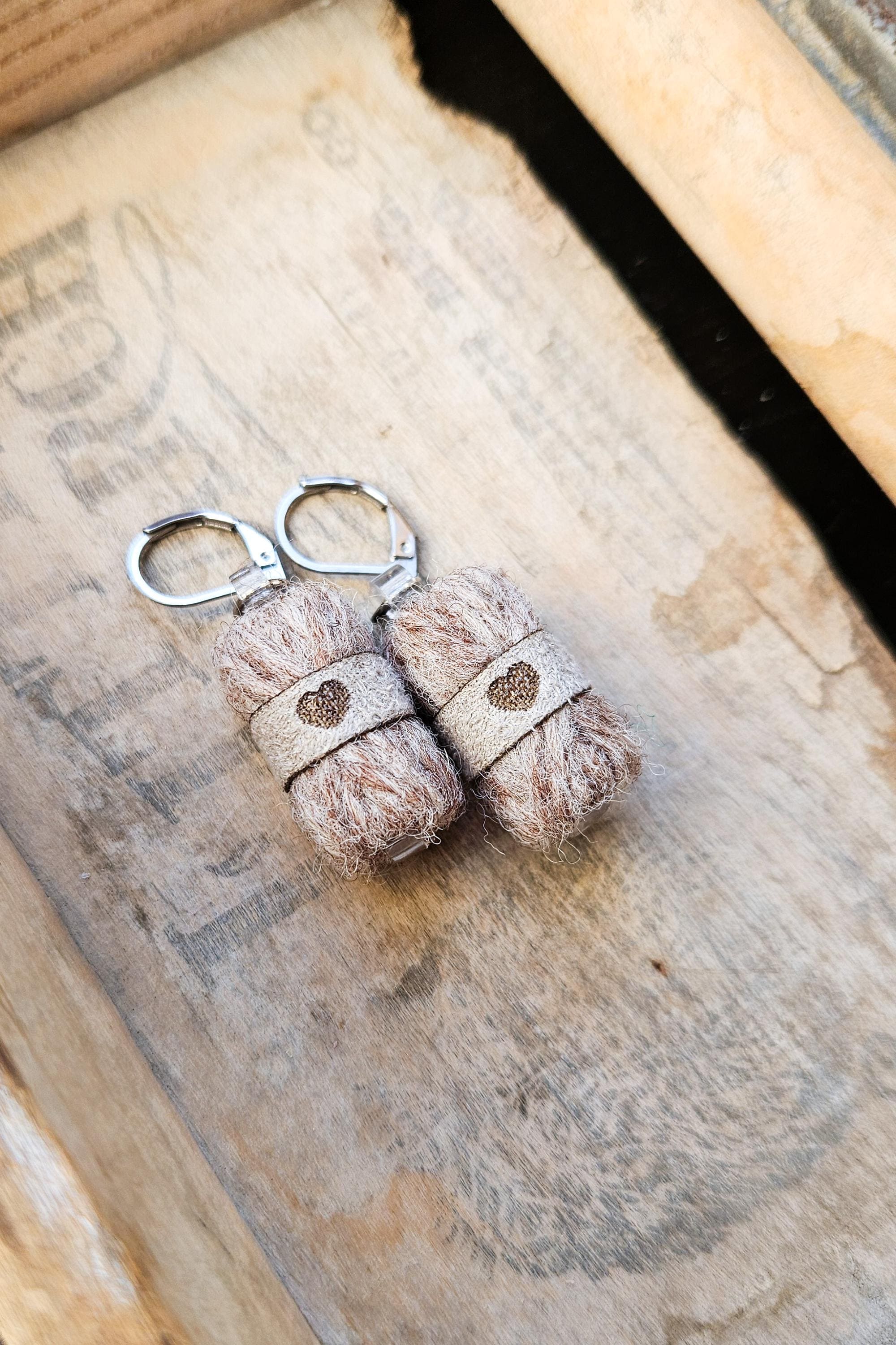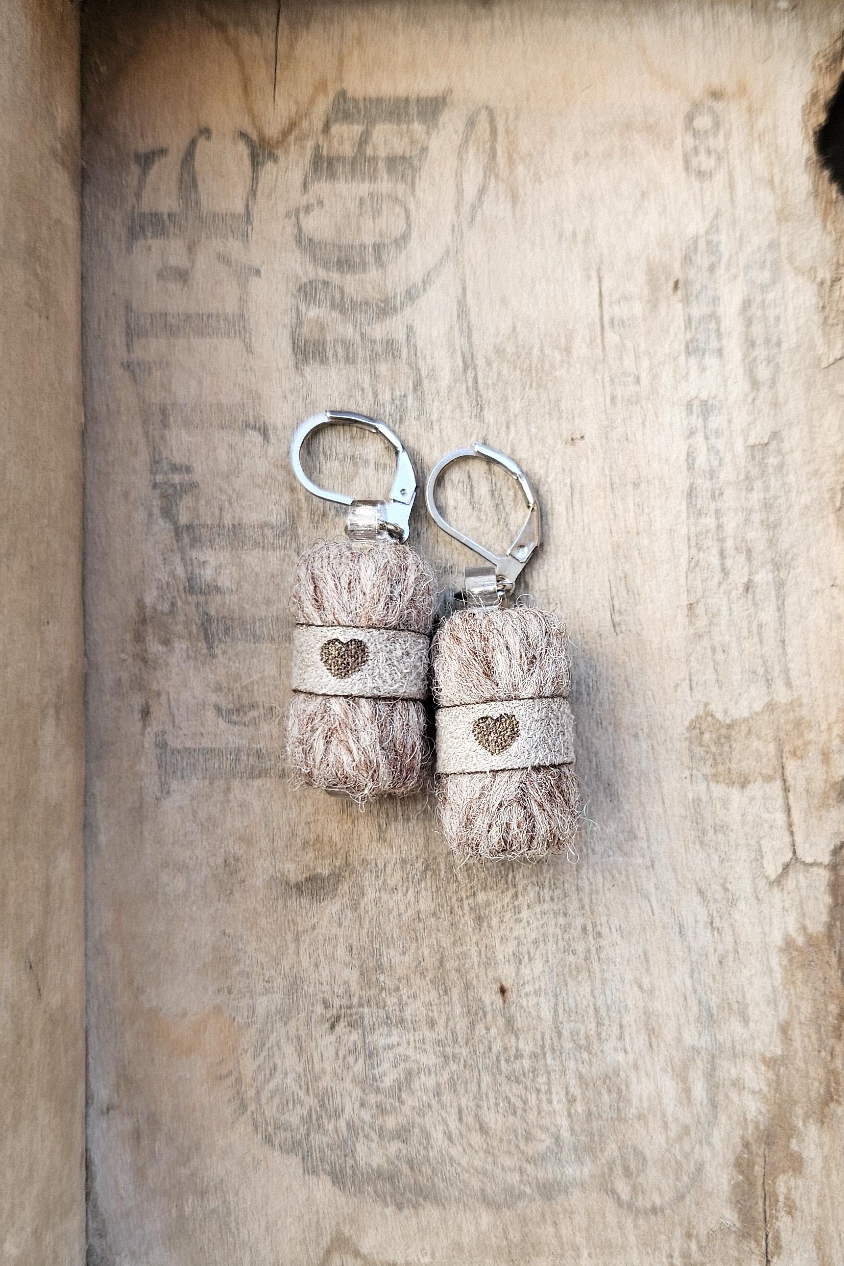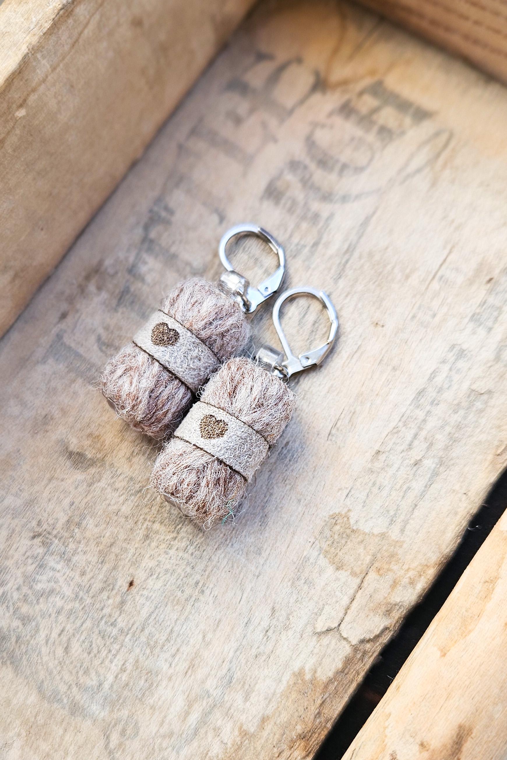 Each pair is handcrafted by me in Québec, Canada, using pure wool and stainless steel hooks. The little suede band is made from recycled faux suede, laser-cut and engraved with a tiny heart — because love is part of the design.