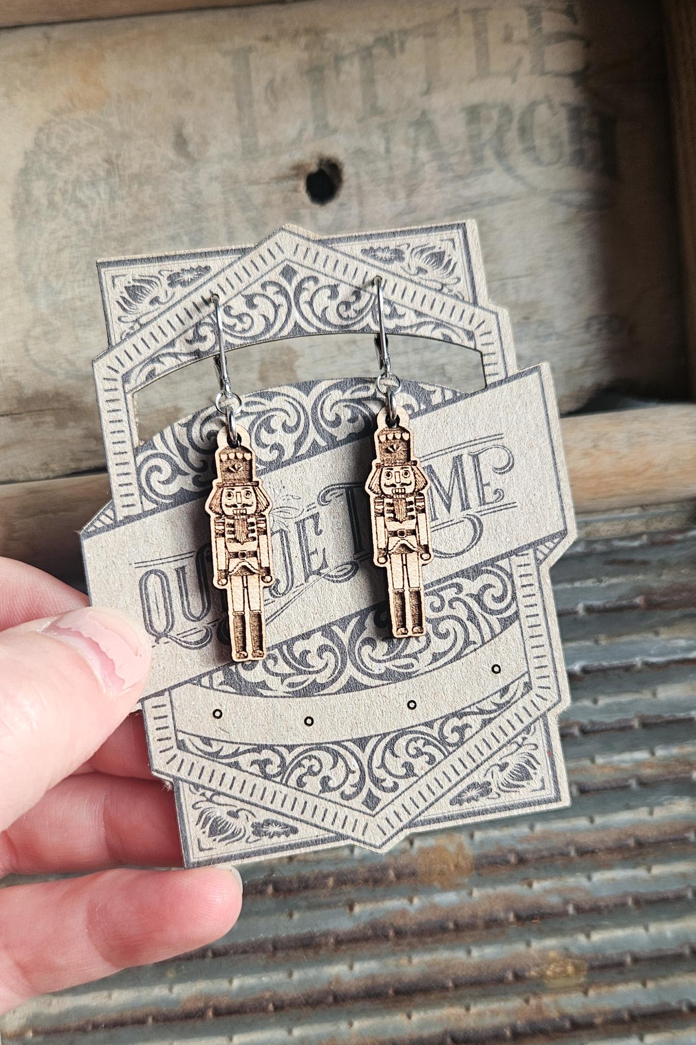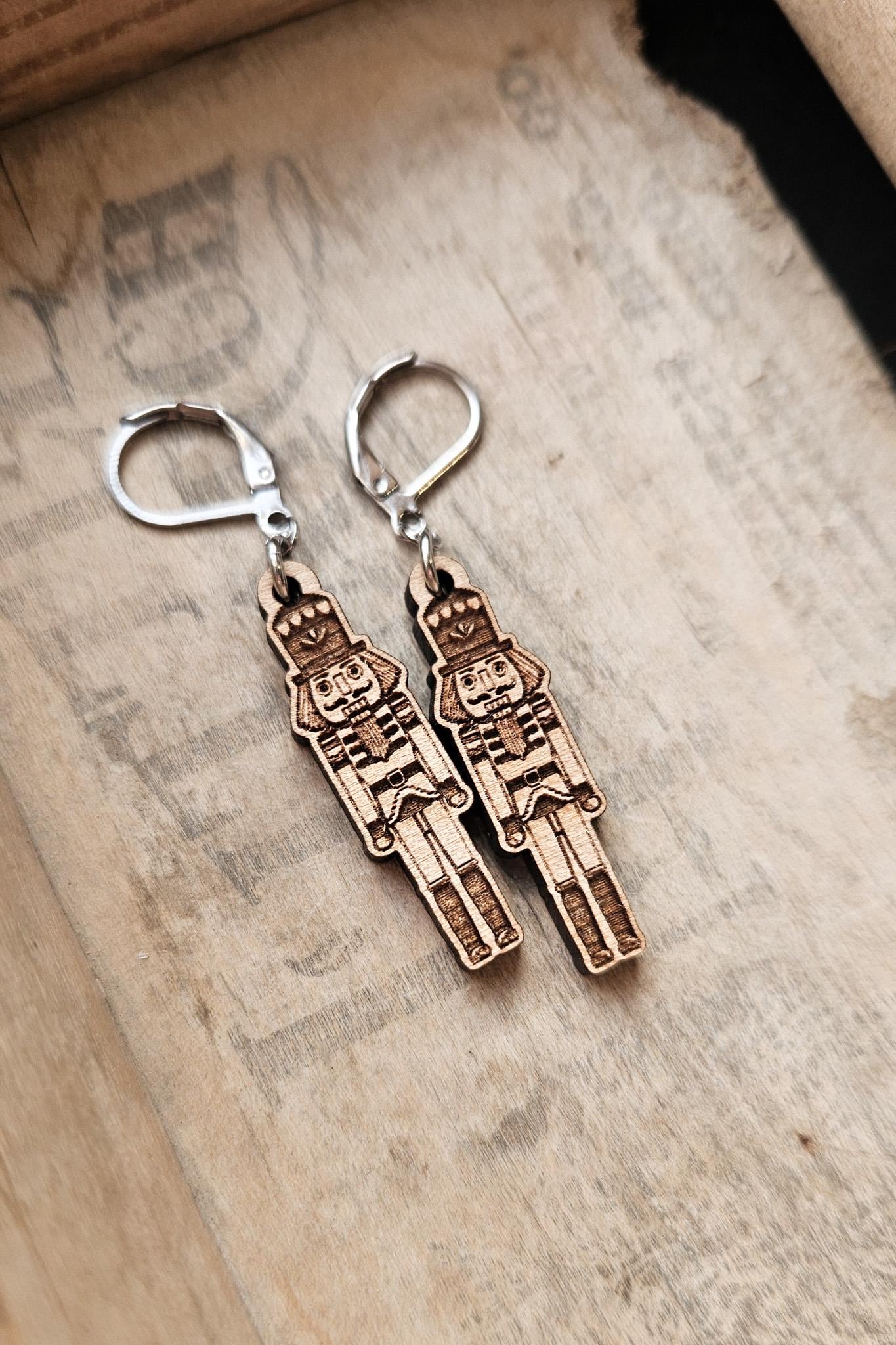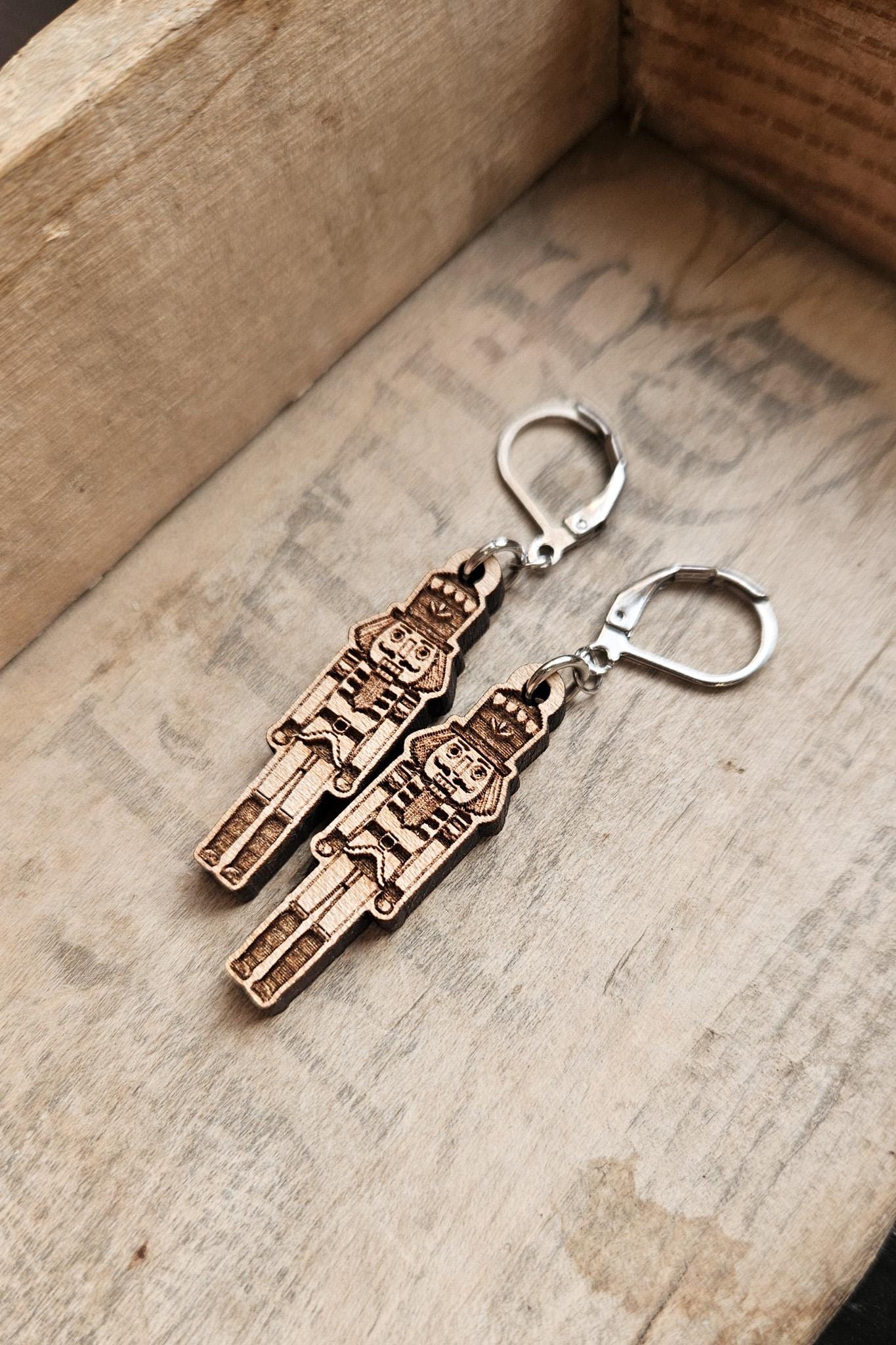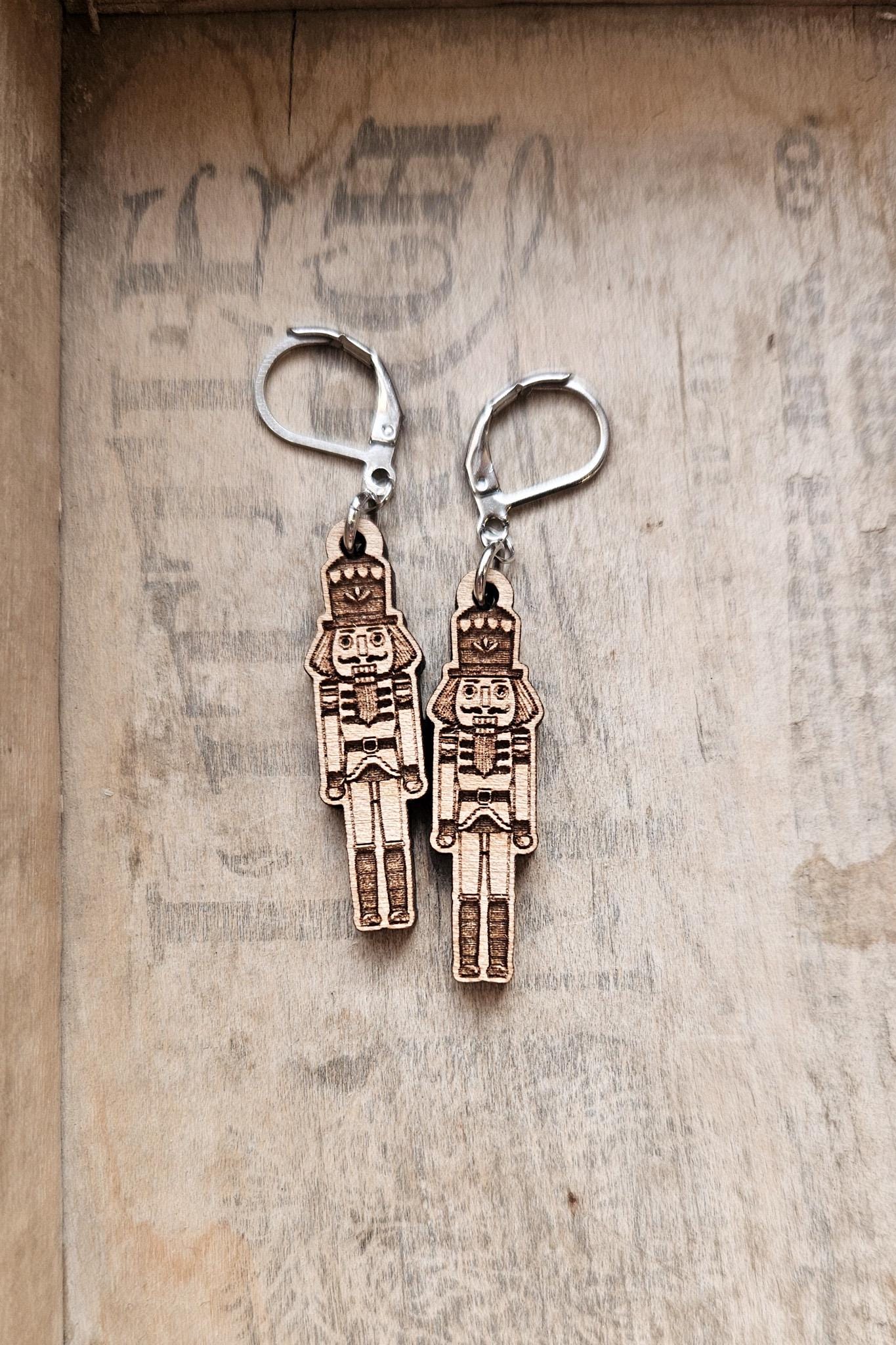 These Nutcracker earrings are handcrafted from local Quebec maple wood — light, festive, and full of charm. Each pair is carefully engraved to highlight the beauty of the wood and the classic Nutcracker figure we all love.